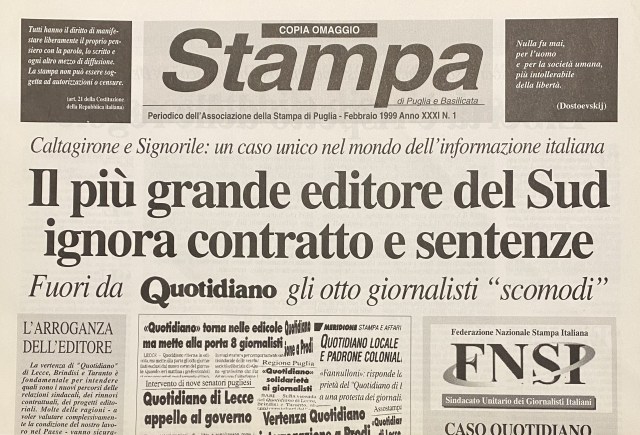 La editrice Edisalento, cioè la società proprietaria del giornale (la sua società), decise di vendere la testata, unico bene con qualche valore, facendo affondare tutto il resto. Insomma mandava a picco una nave carica di debiti, imbarcando su un’altra scialuppa (la appena costituita Alfa Editoriale Srl) la testata, cioè il logo, quindi la storia di un giornale che aveva valicato il muro delle ventimila copie di vendita. Signorile insomma vendette un bene a se stesso, collocandolo in una società senza debiti. Ma decise di fare transitare nella nuova società, affinché Quotidiano potesse tornare in edicola con un nuovo editore che in realtà era sempre lo stesso, solo i redattori graditi, quelli cioè che non avevano rotto le palle nel corso della demolizione. In otto restammo fuori: oltre me, c’erano Marcello Tarricone, Marcello Orlandini, Roberto Guido, Paolo Melchiorre, Massimo Melillo, Vito Luperto, Franco Sinisi.
